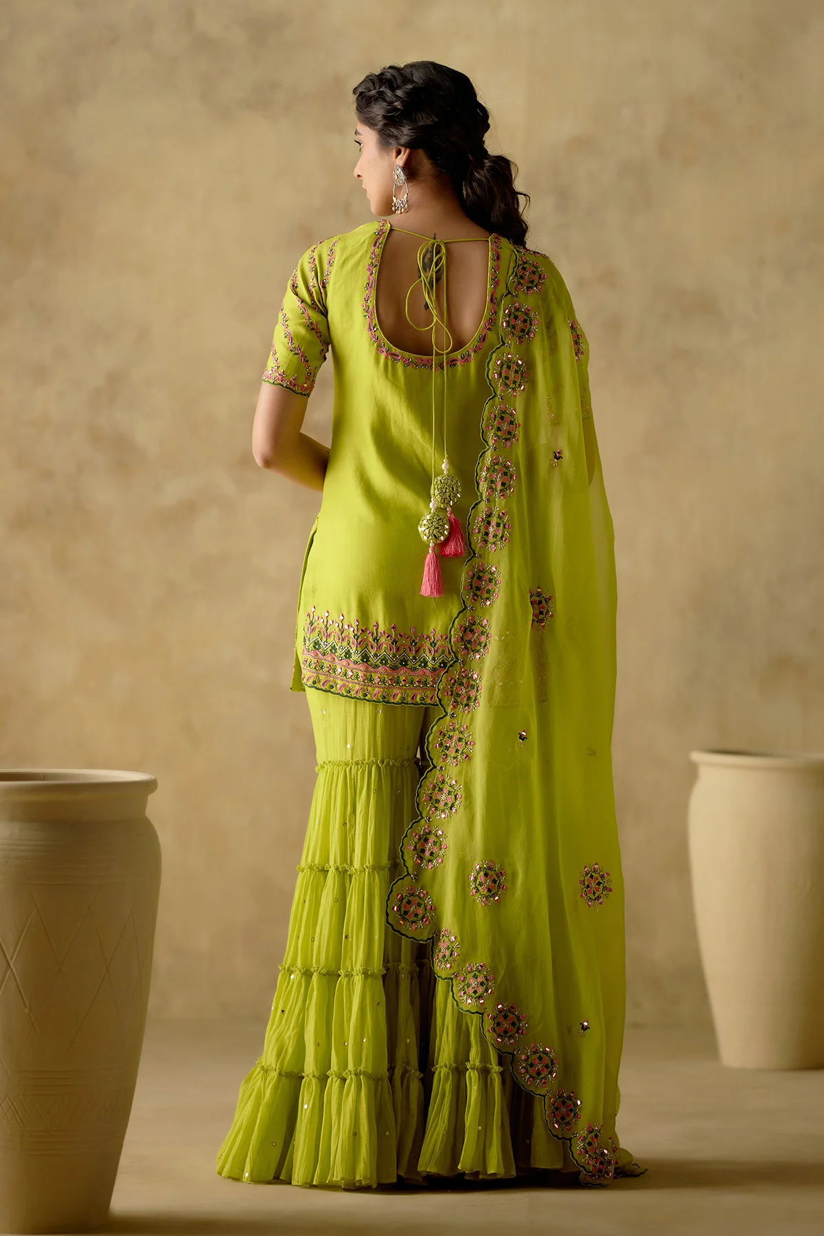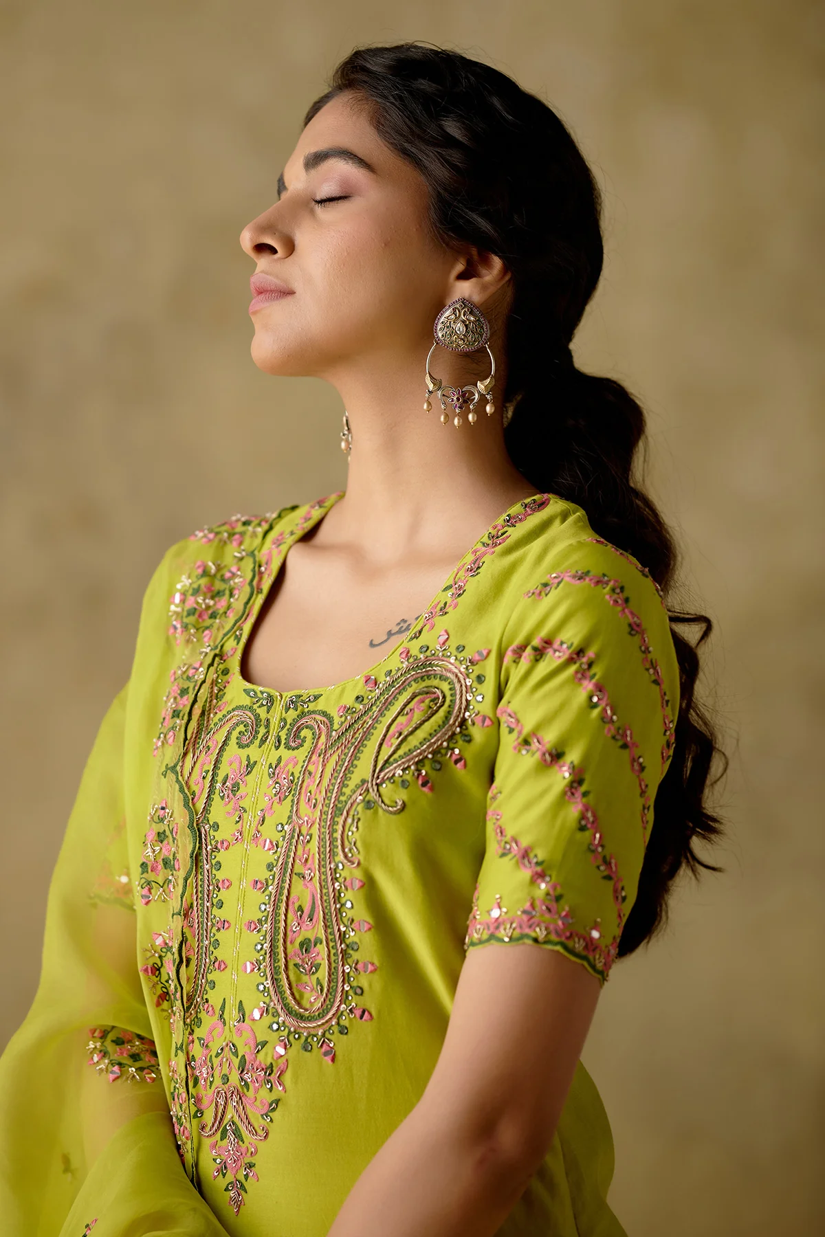 Fabric Used – Kurta & garara – chanderi silk lined with mul cotton , dupatta – organza Color – Neon Green